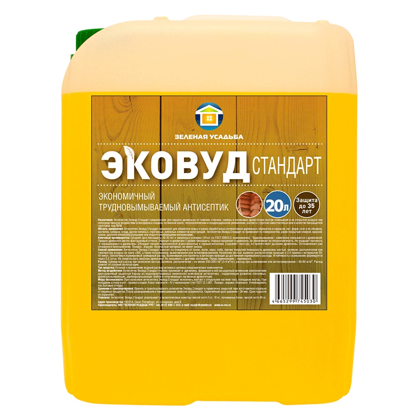 Расшифровка маркировки: Зеленая Усадьба - торговая марка, Эковуд Стандарт - модель антисептика, 20кг - фасовка.