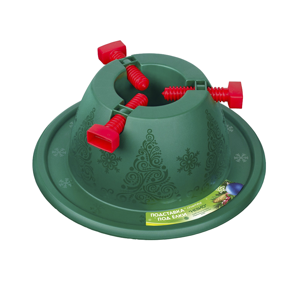 Подставка состоит из резервуара и специальных регулируемых креплений, которые надежно фиксируют ствол. Винтовая система креплений позволяет установить ель с разным диаметром ствола. Резервуар можно наполнять водой для сохранения свежести елки.