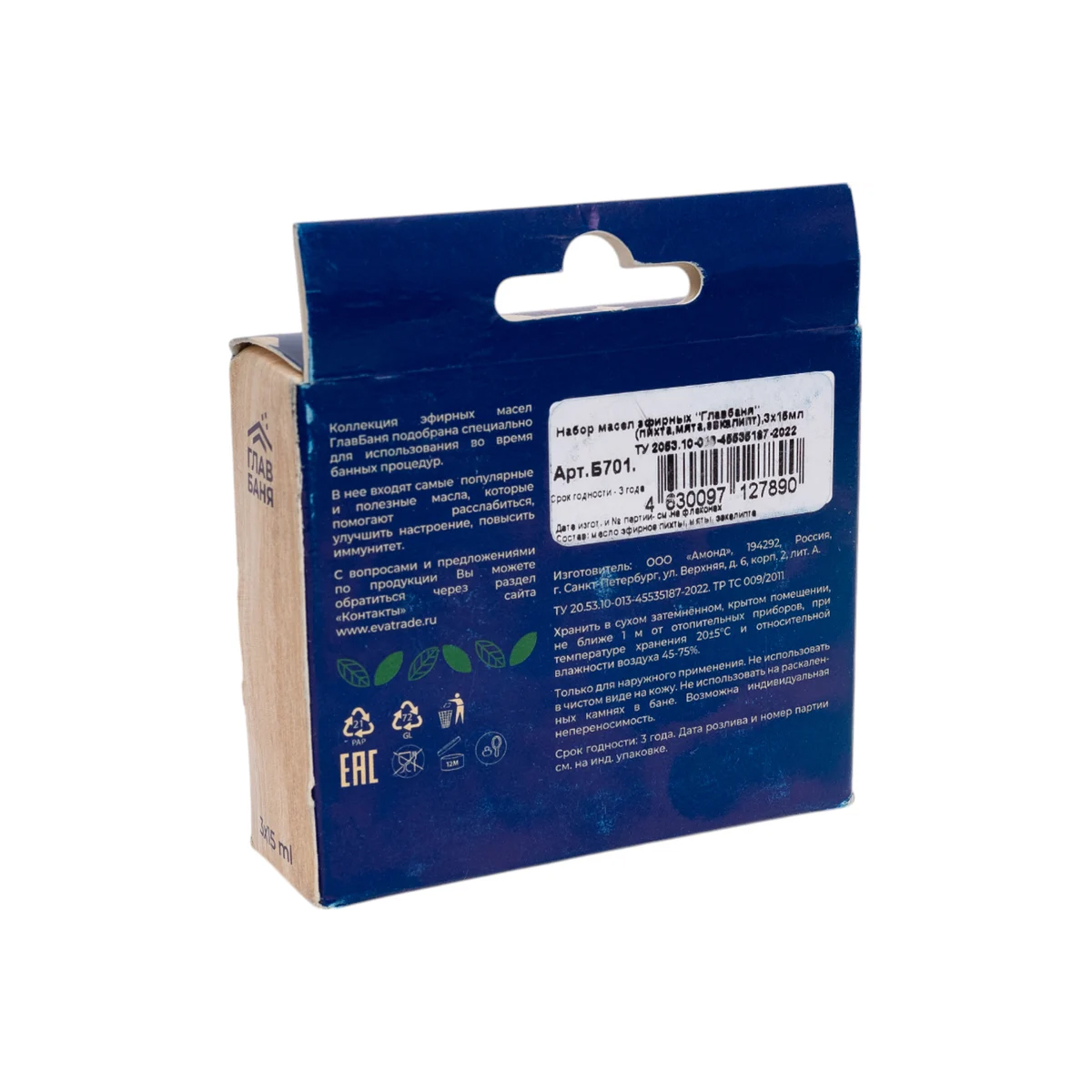 Все характеристики, изображения и описание товара "Набор масел эфирных (пихта, мята, эвкалипт) ГлавБаня (3х15 мл)" носят