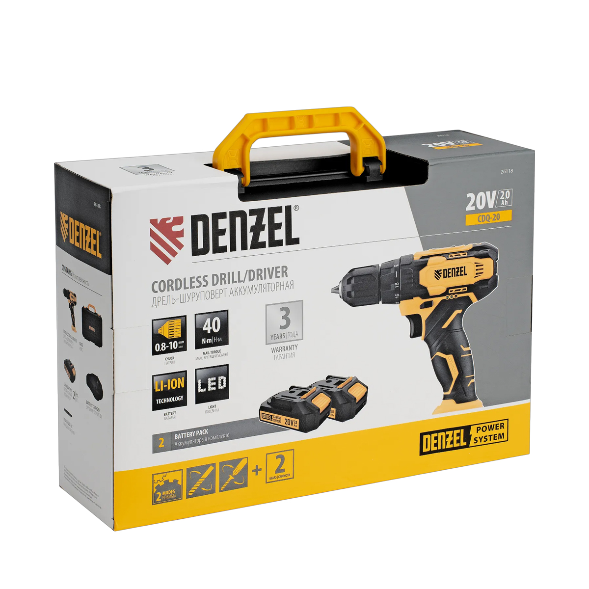 Все характеристики, изображения и описание товара "Дрель-шуруповерт аккумуляторная Denzel CDQ-20" носят