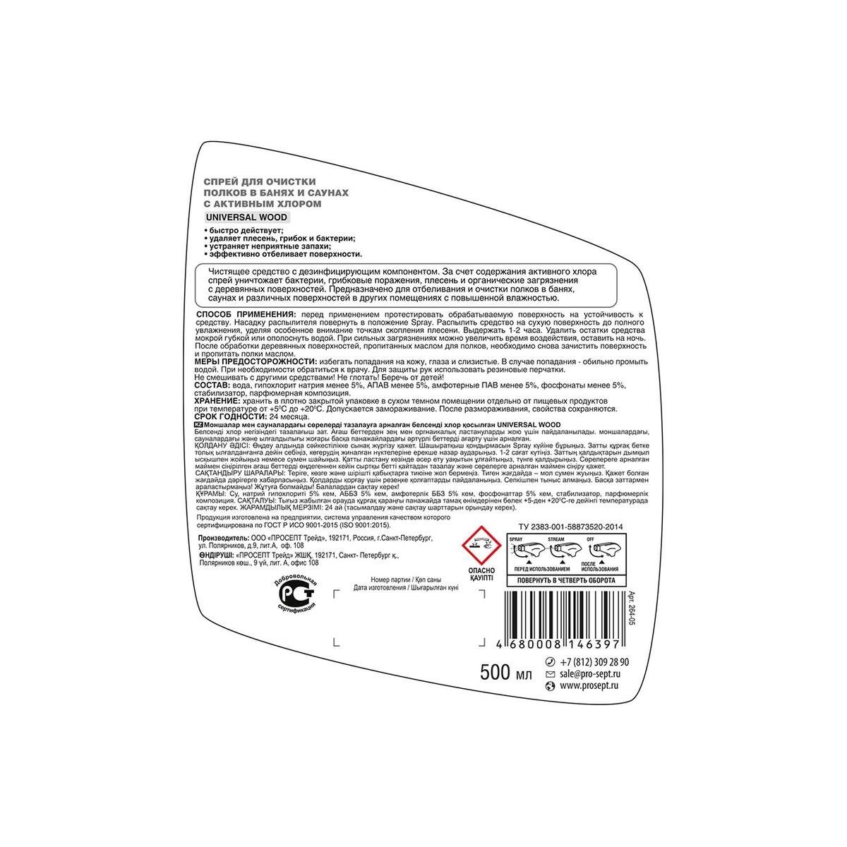 Все характеристики, изображения и описание товара "Спрей для очистки полков в банях и саунах Prosept Universal Wood (0.5 л)" носят