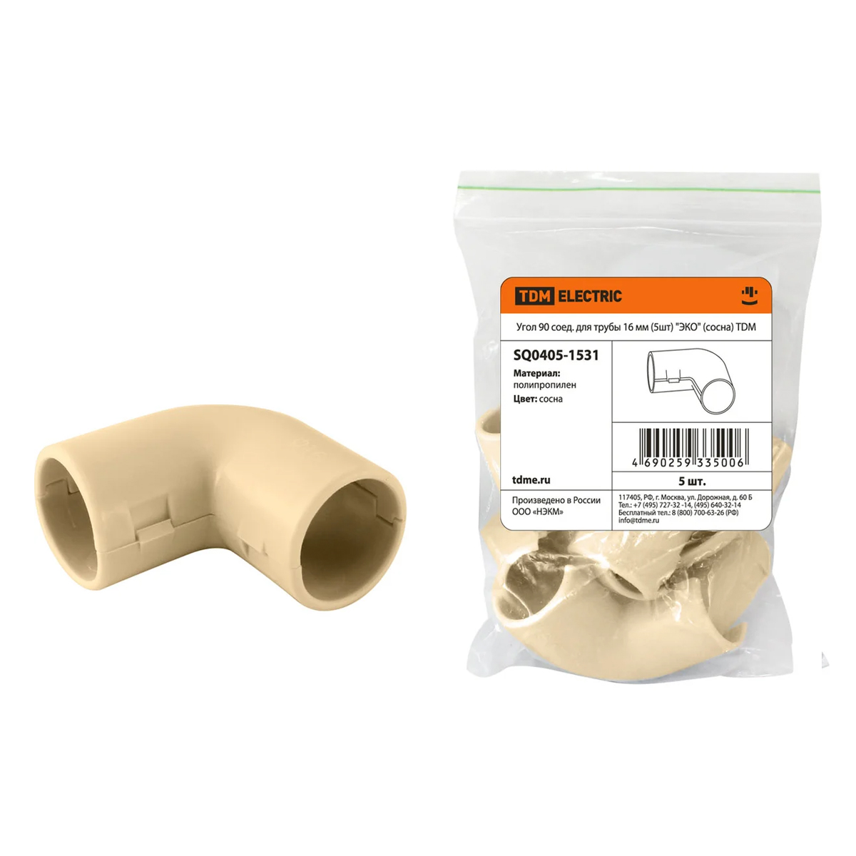 Все характеристики, изображения и описание товара "Угол 90 соединительный для трубы 16 мм (5 шт) TDM Еlectric "ЭКО" SQ0405-1531 (сосна)" носят