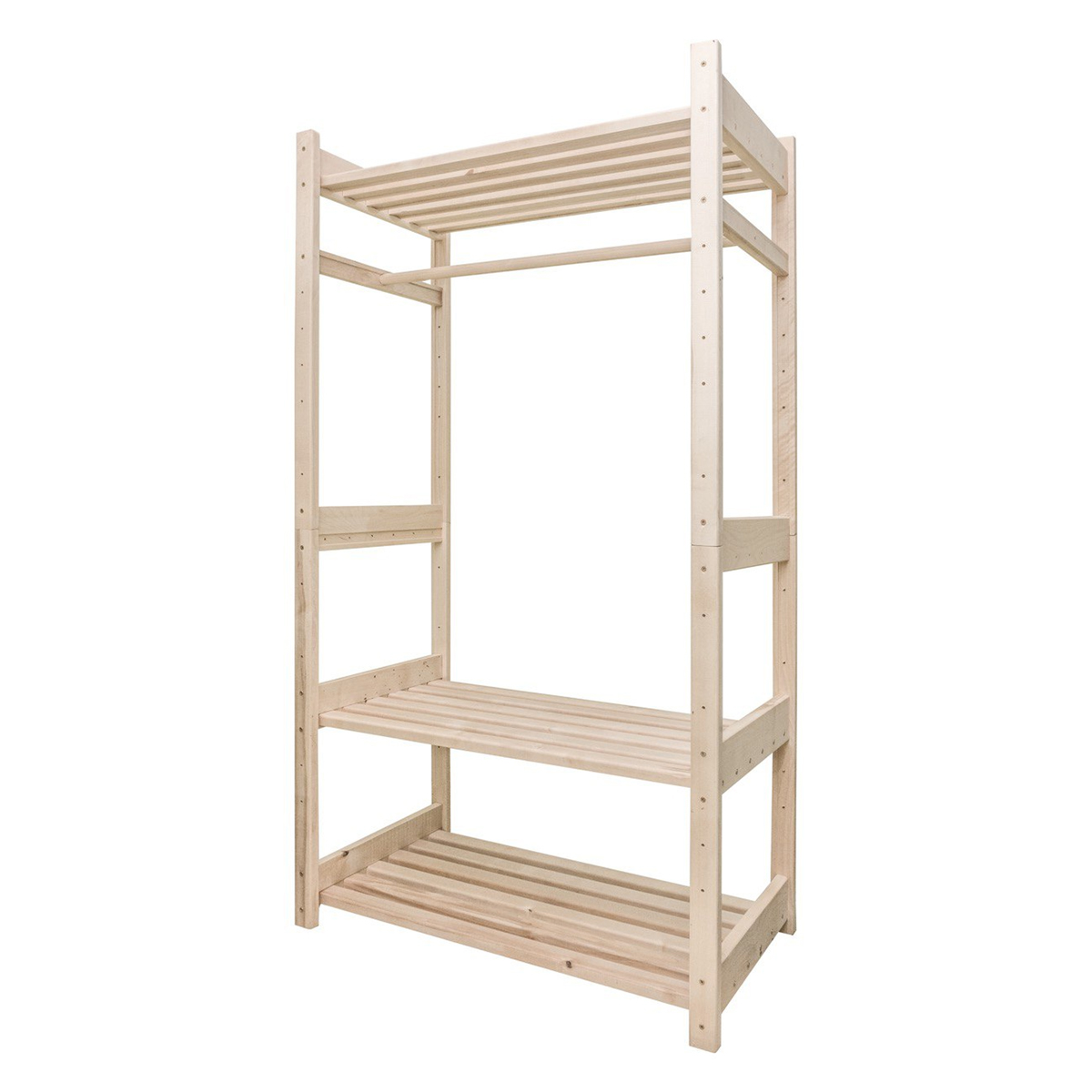 Все характеристики, изображения и описание товара "Стеллаж деревянный 3 полки, 1 вешалка №15" носят