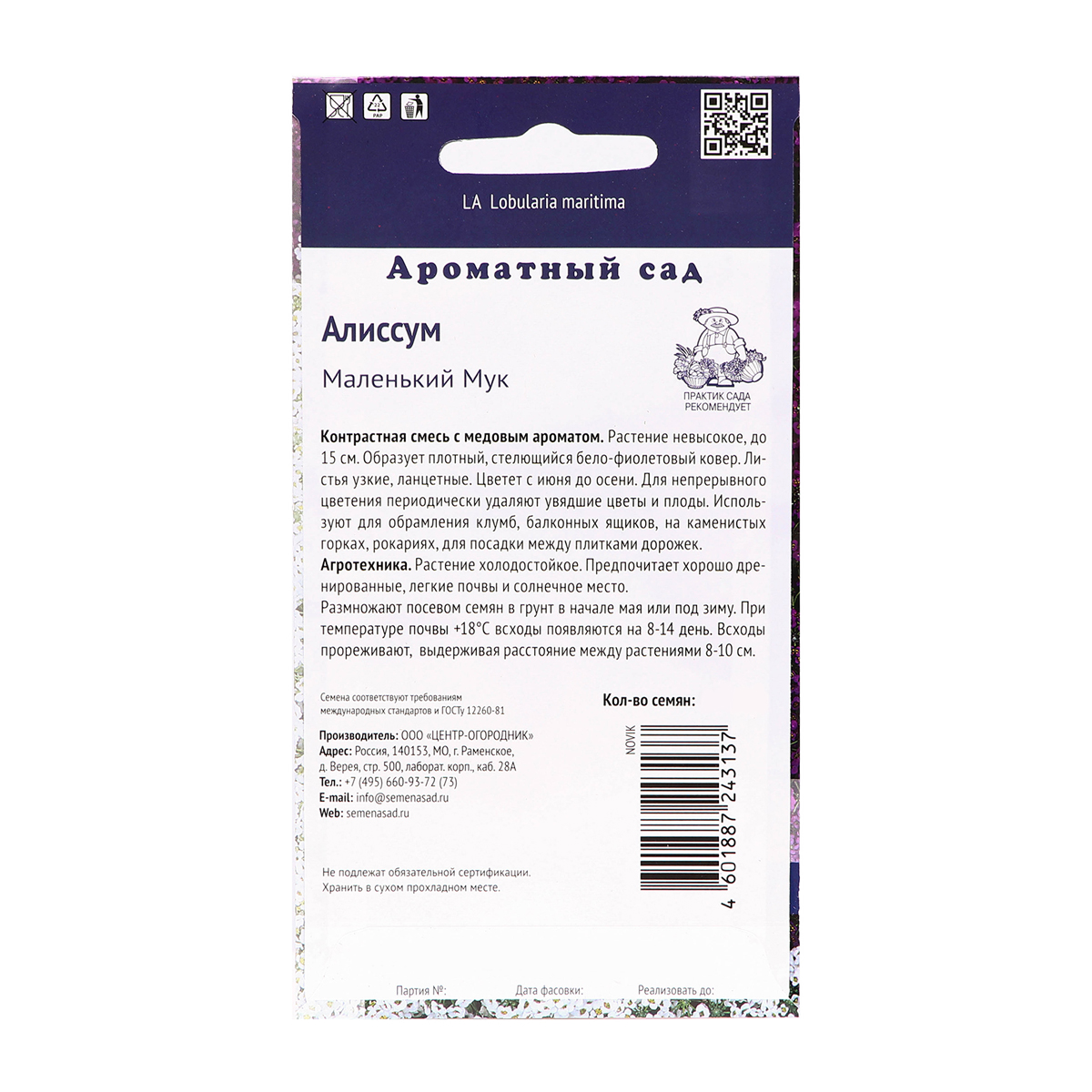 Все характеристики, изображения и описание товара "Семена цветов Алиссум Маленький Мук Поиск (0.3 г)" носят