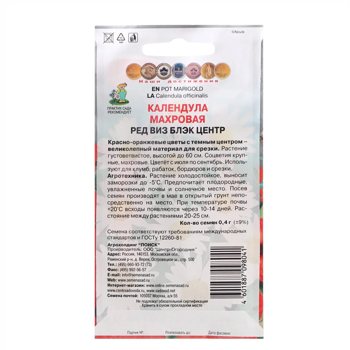 Все характеристики, изображения и описание товара "Семена цветов Календула Махровая Ред виз блэк центр Поиск (0.4 г)" носят