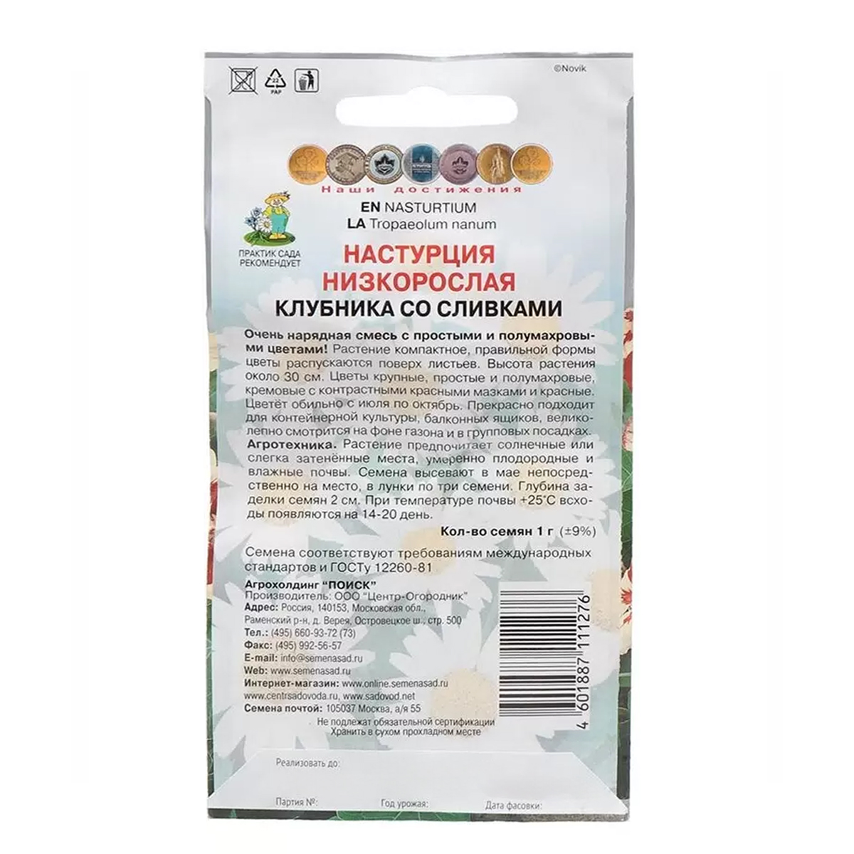 Все характеристики, изображения и описание товара "Семена цветов Настурция Низкорослая Клубника со сливками Поиск (1 г)" носят
